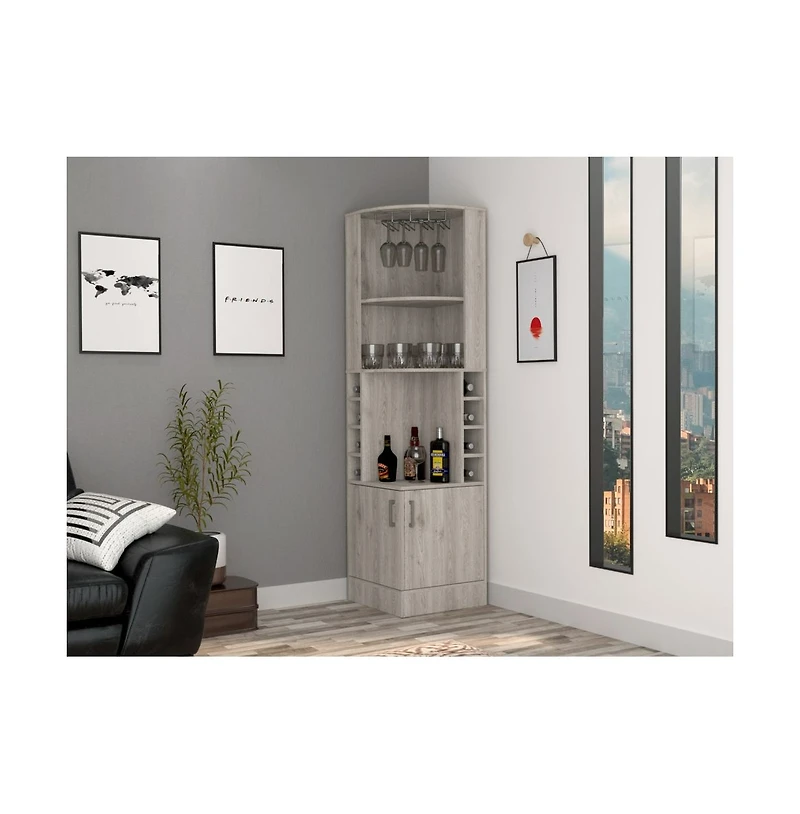 This corner bar cabinet features space-saving design, 8 bottle cubbies, 2 open shelves, double doors accessible from any side, 12-slot wine glass rack. Decor and accessories not included, matching collection sold separately.