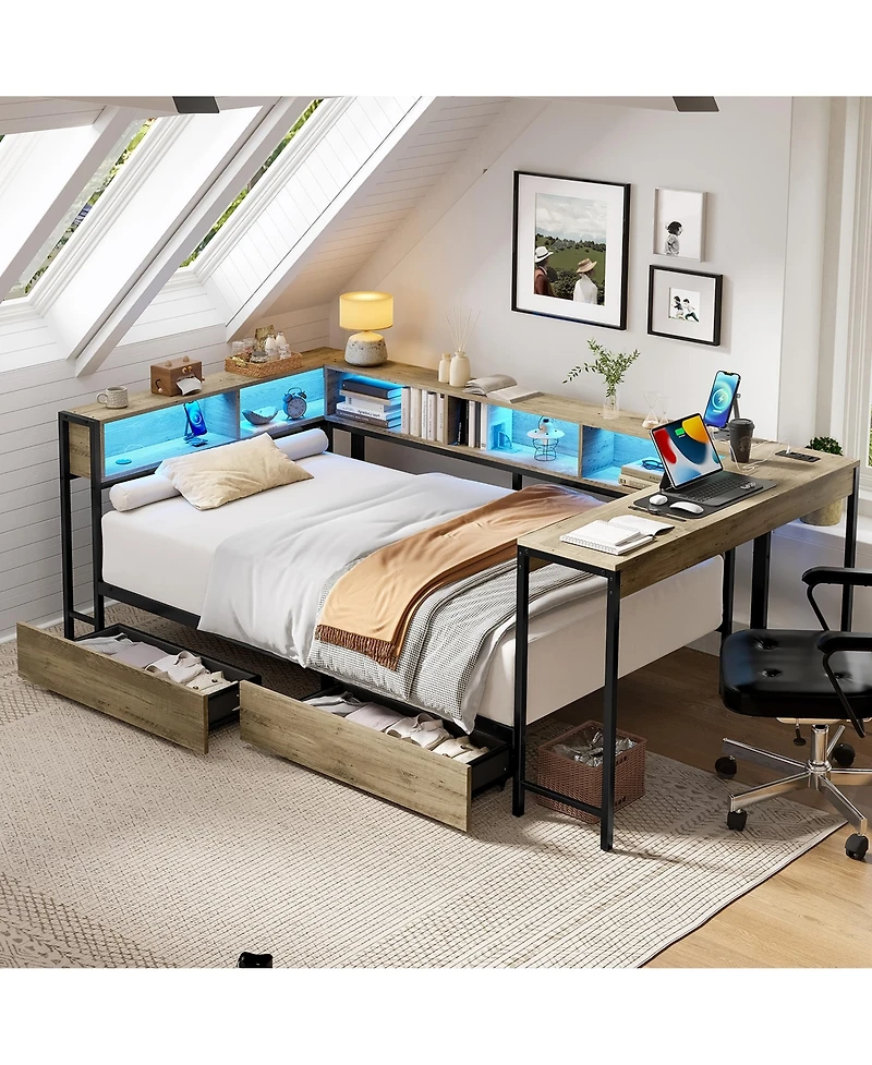 flynama Corner Bed Frame With Bookcase Led Lights Charging Station 2 Storage Drawers