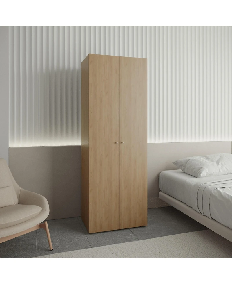 This 2 doors closet armoire features a metal hanging rod and fixed storage shelf It offers generous enclosed storage for clothes and accessories Compact size fits small bedrooms and apartments Made of durable engineered wood for modern home use