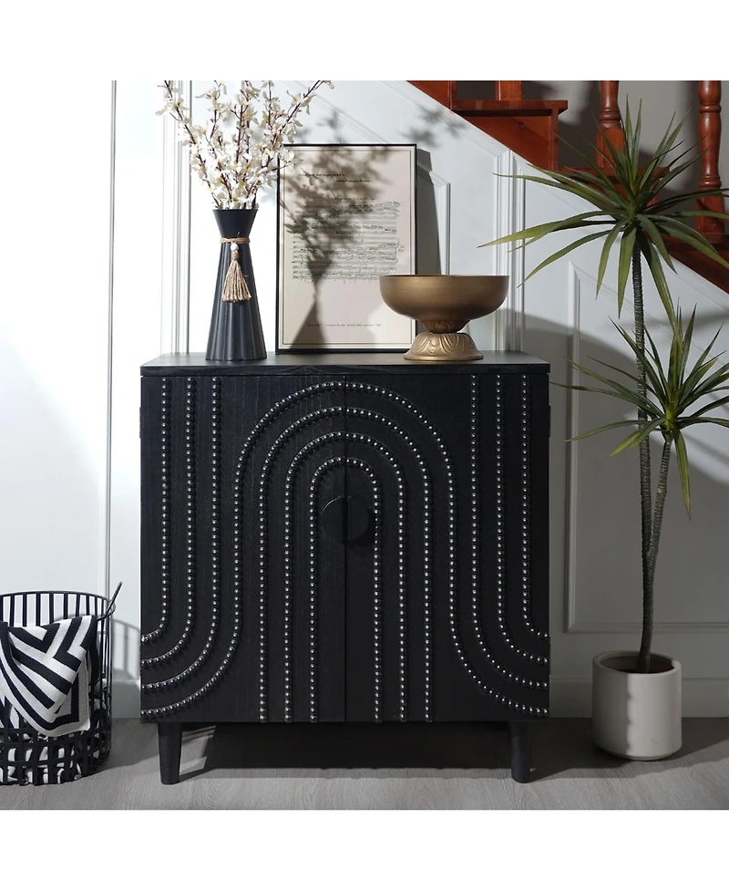 This 30in modern black storage cabinet has decorative round bead door, 2-tier shelves, 5.1in solid wood legs. It is stylish compact for small spaces, sturdy manufactured wood build, versatile as sideboard, nightstand and entryway cabinet.