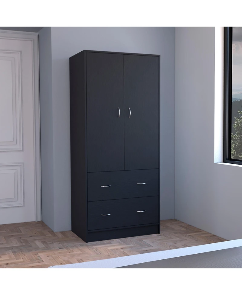 This black Taly armoire measures 70.9inch H x 30.9inch W x 19.0inch D with two double doors and two drawers. Made of high quality laminated particle board it provides large storage capacity for clothes and personal items in bedroom