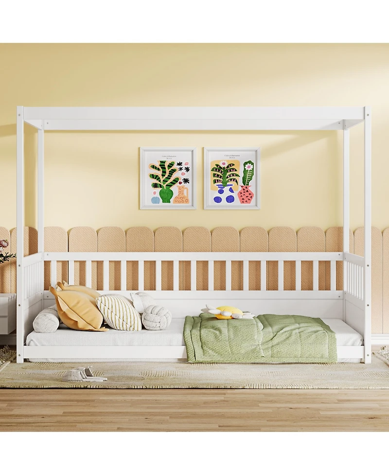 flynama Twin Size Wooden Canopy Floor Bed With Guardrails Four Poster Design For Kids