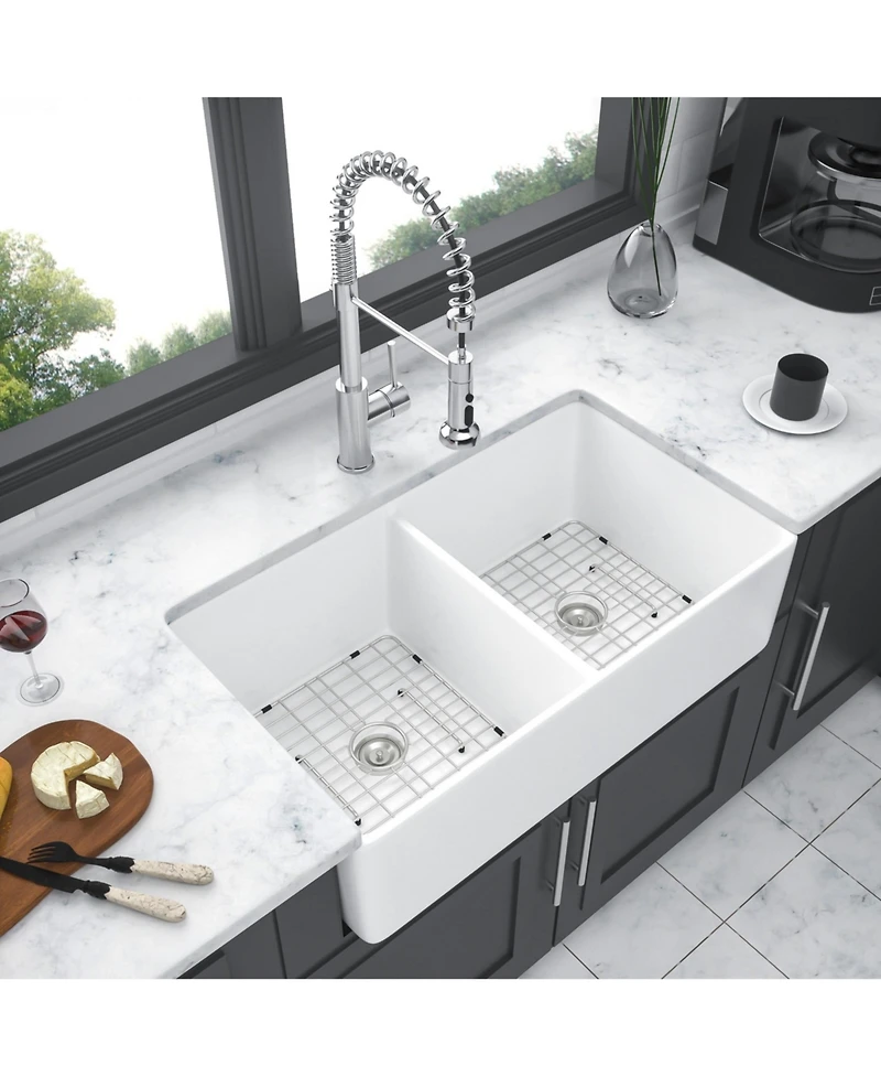 Add timeless elegance and robust function to your kitchen with this 32 inch white farmhouse sink featuring two equally spacious basins Its durable glazed ceramic construction and comprehensive accessory set offer exceptional stain resistance and easy cleaning for lasting beauty