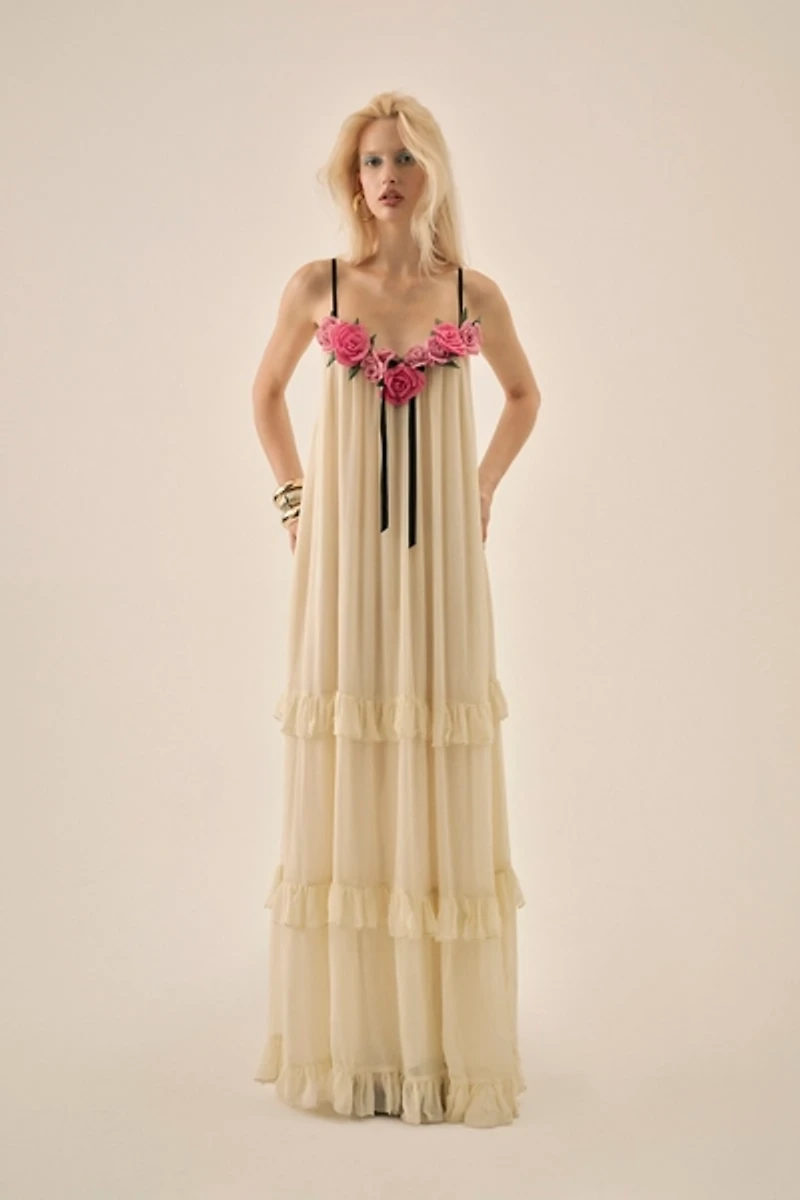 Endlessly romantic For Love & Lemons maxi dress made special with handcrafted rosette embellishments along the neckline. Long white dress in a flowing silhouette featuring a plunging v-neckline, velvet straps, contrast velvet straps and twirl-worthy tiered ruffles along the skirt. Topped with a contrast velvet bow detail at the neckline and back for a sweet finish.