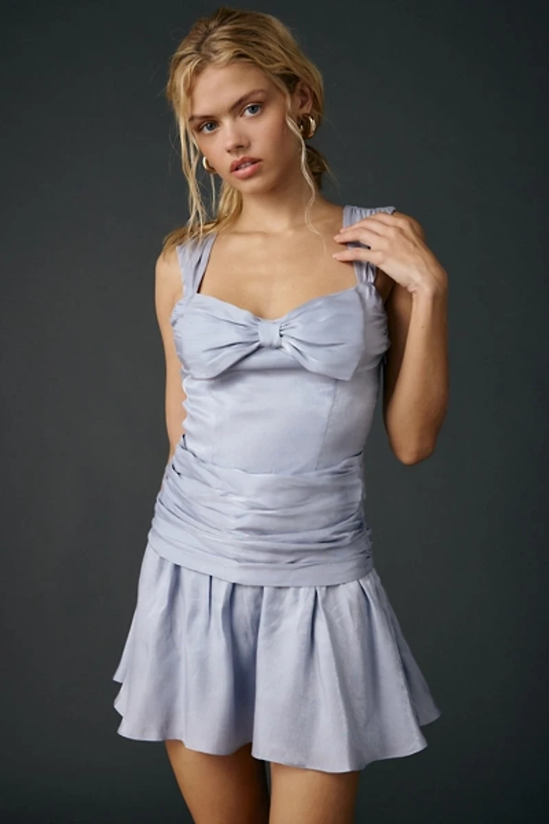 Party-ready For Love & Lemons mini dress designed in a shimmering, lightweight chiffon fabric. Sparkly mini dress designed with a sweetheart neckline, ruched tank straps, drop waist bodice with draped detailing and a low open back topped with a tie detail. Finished with bow details at the bust and back for an ultra-femme finish.