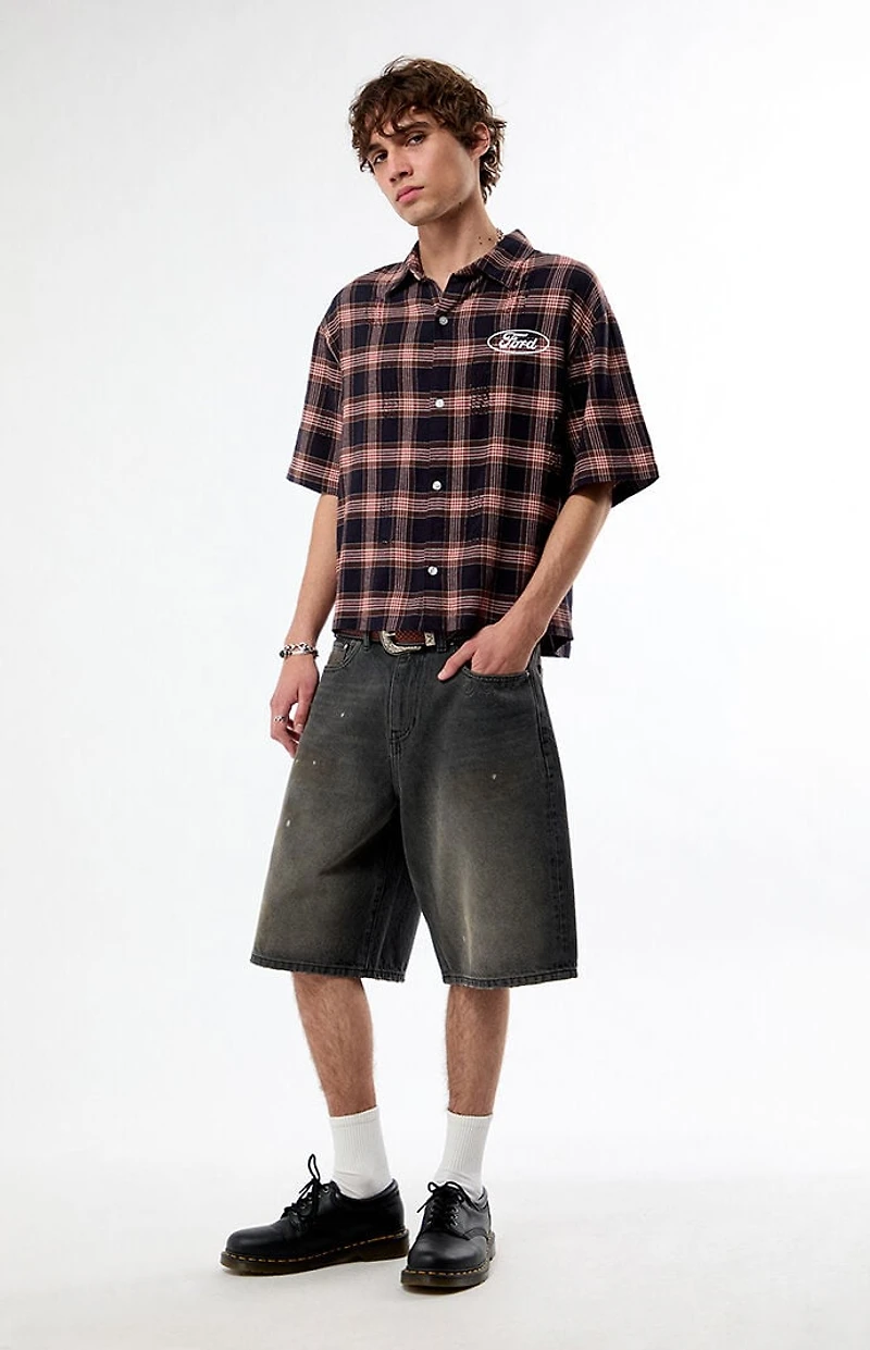 The Ford Dirty Black Wash Baggy Jean Shorts bring relaxed, street-ready style to your warm-weather rotation. Featuring a dirty black wash, rigid fabric, Ford Mustang front graphic, Ford emblem embroidery on the back pocket, and a baggy fit with oversized legs for bold, easygoing comfort.