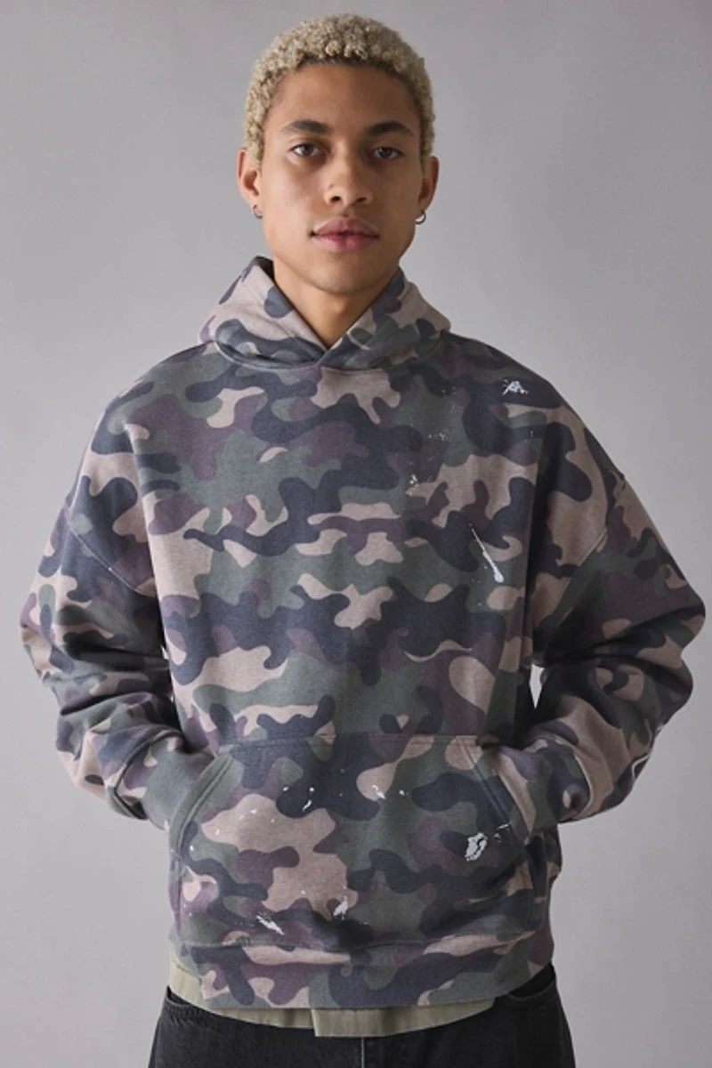 Allover camo pattern hoodie with Ford logo graphics. Pullover hooded sweatshirt with a pouch front pocket and ribbed knit trims. Features paint splatter accents. Cut in an oversized fit.