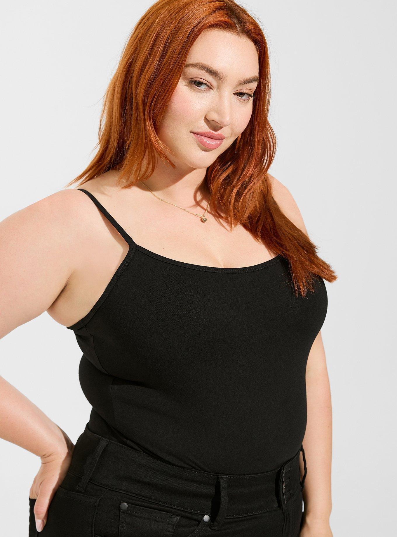 FIT Model is 5'10'' wearing size 1. Cami silhouette. Fitted throughout for a sleek look. Measures 30'' from shoulder (size 2). MATERIALS + CARE Foxy knit fabric: Holds you in, smooths you out and doesn't ride up. Stretch level: Maximum. 95% cotton, 5% spandex. Machine wash cold. Tumble dry low. Imported. DETAILS Scoop neckline Sleeveless. Adjustable straps.