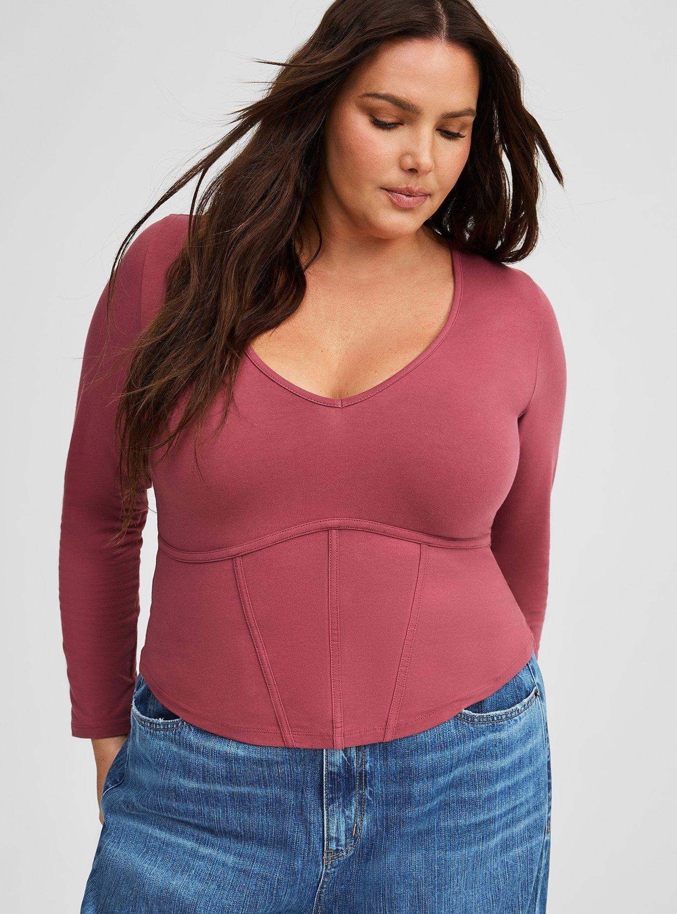FIT Measures 24"" from shoulder (size 2). Shorter length, hits at waist. MATERIALS + CARE Foxy knit fabric: Holds you in, smooths you out and doesn't ride up. Stretch level: Maximum. 95% cotton, 5% spandex. Machine wash cold. Tumble dry low. Imported. DETAILS V-shaped neckline. Long sleeves. Corset-style details.
