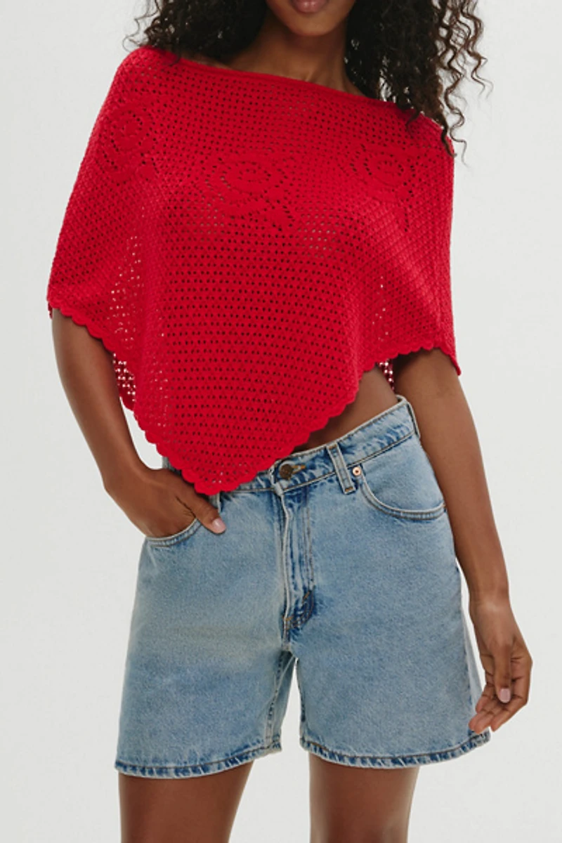 Crochet cape top from Frankies Bikinis featuring a rose pattern motif. Semi sheer cotton fabrication & finished with scallop trims.