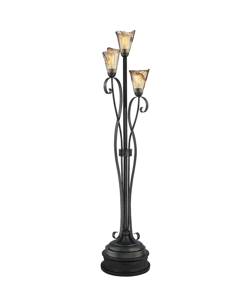 An elegant nature-inspired design from Franklin Iron Works, this three-light tree floor lamp with a round black riser comes in a powder-coated black finish metal frame. Decorative scrolls that resemble stems and leaves accentuate the lamp. The amber glass shades come with wavy edges and are designed after tulip buds. On the bottom is a round black riser for extra height. The result is a lovely transitional country-cottage look for your living room or bedroom.