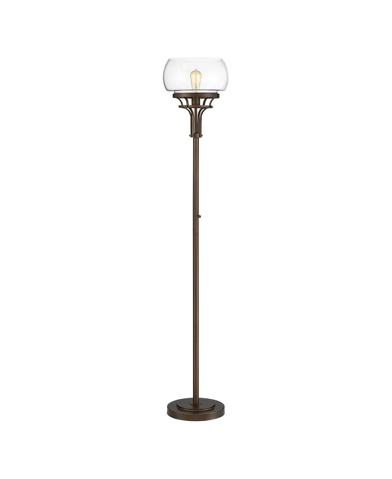 Another impressive option from Franklin Iron Works, this torchiere floor lamp with a Usb dimmer is a lovely choice for a bedroom or living area. The lamp features a stacked base and slim column in an oil-rubbed bronze finish and a beautiful glass shade. Add a vintage Edison bulb for warm ambience. The tabletop dimmer works with dimmable Cfl and dimmable Led bulbs, as well as halogen and incandescent bulbs, and it also comes with a built-in Usb port, allowing you to easily charge phones and other devices.