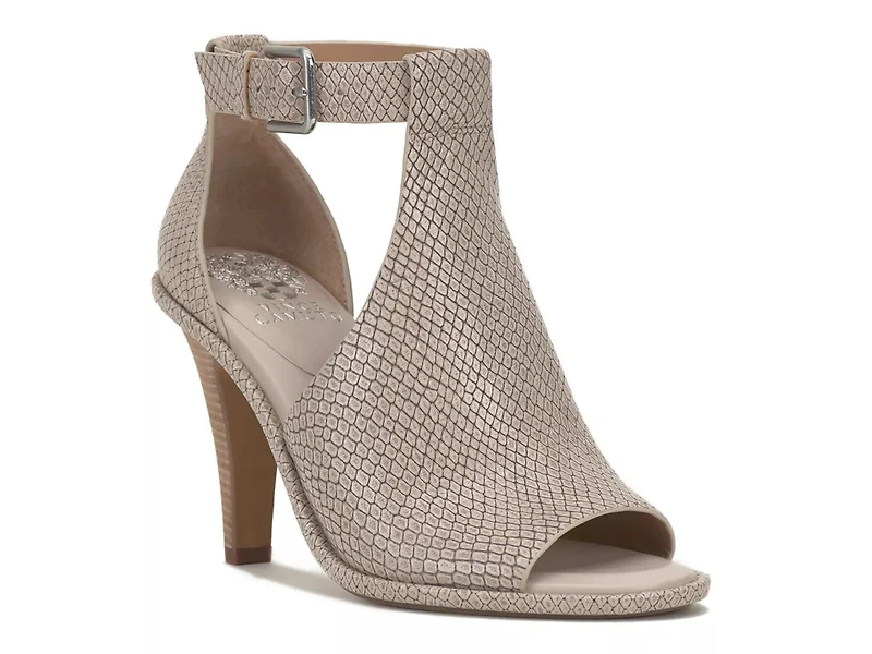 Add oodles of style to your everyday look with the Frasper sandal from Vince Camuto. Lifted by a chic tapered heel, this leather sandal displays a smoothly covered vamp with round peep toe and an ankle buckle strap closure for easy on/off.