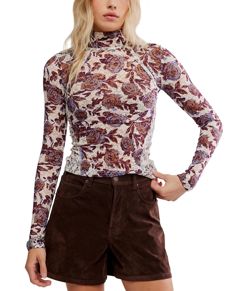 Effortlessly stylish and sleek, this Lyric top from Free People features a pull-on design with long sleeves. The bold, fitted silhouette shows a sheer floral mock neck crafted from stretchy mesh fabric. About The Brand: If you love the laid-back charm of boho-chic apparel, you'll find a beautiful selection from Free People at Macy's that suits your style. From ultra-feminine dresses to cute tops, browse the collection of casual, hip designs.