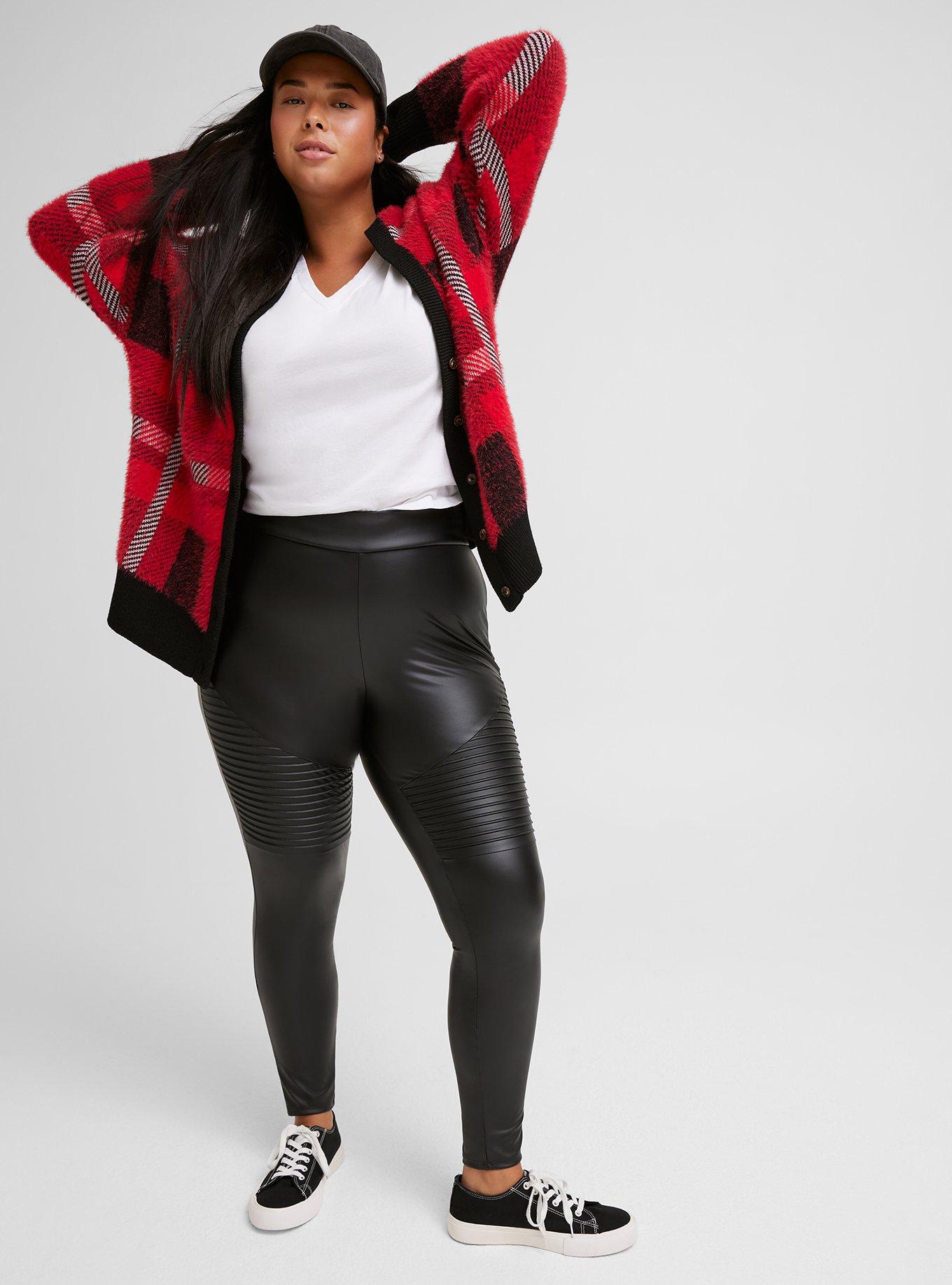 The sleek black knit style has the look of moto pants but all the comfort of stretchy, breathable leggings.