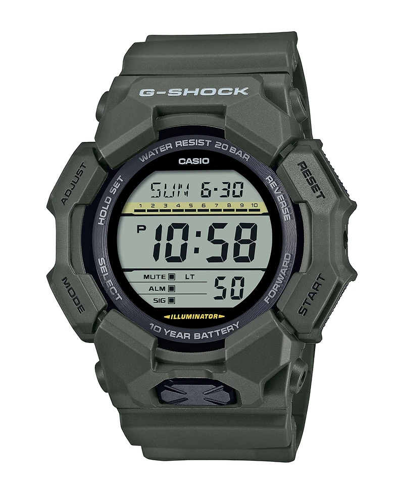 Enjoy a life of fewer battery changes with a large-case G-shock with a 10-year battery you won't have to worry about for ages. The digital GD010 delivers handy features like world time and stopwatch, as well as a high-brightness Led light, which can be easily accessed from the large button on front of the case, ensuring visibility even in the dark. Made with resin and equipped with a 10-year battery, this G-shock is great if you want to reduce environmental impact.