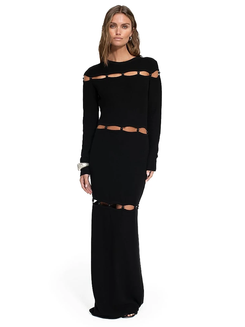 All eyes on you. Edgy and elegant, this bold Maxi Dress is embellished with strategic cutouts and accented with sophisticated black beading.