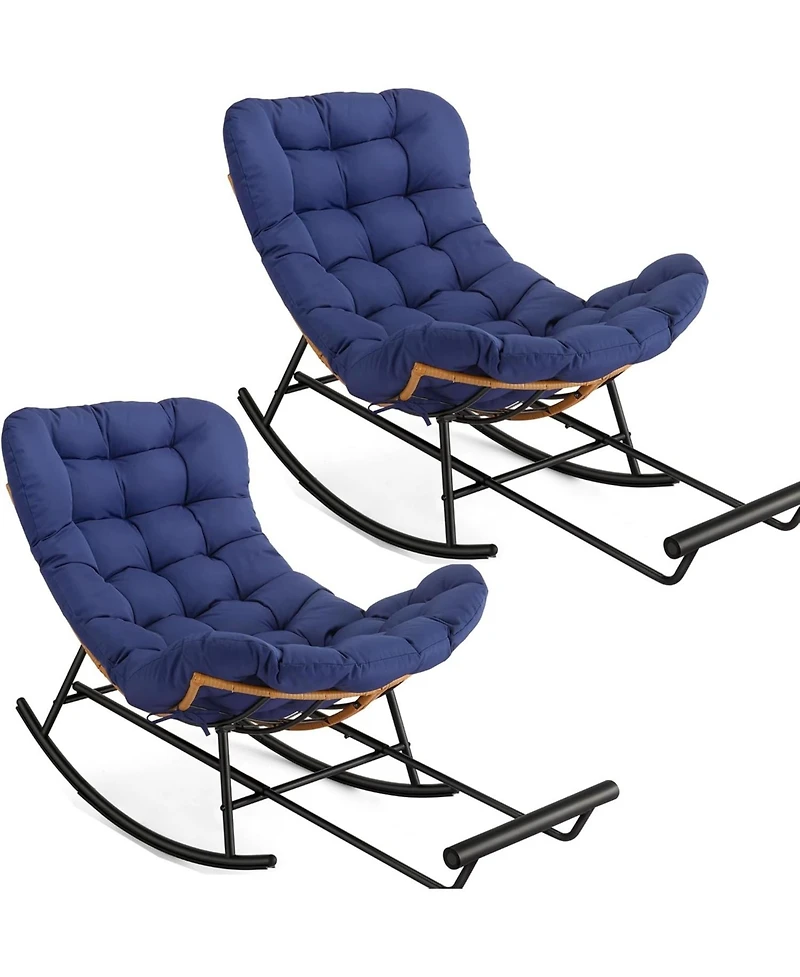 Get a pair of papasan rocking chairs with footrests, oversized for comfort, sturdy rattan and metal frames, and removable cushions—great for indoor or patio relaxation.