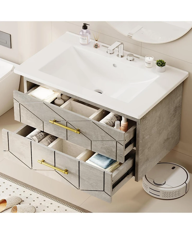 gaomon 30" Bathroom Vanity with Sink Combo Floating Bathroom Vanity with Ceramic Basin 2 Large Drawers with Gold Handle Soft-Close Design