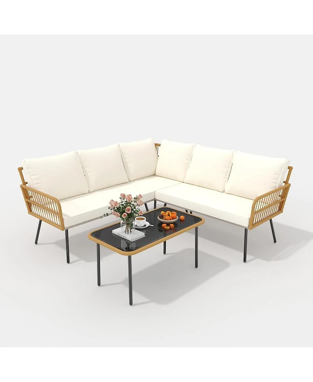 gaomon 4 Pieces Outdoor Patio Furniture Set with Table, All-Weather Boho Wicker Rattan Patio Sectional L-Shaped Sofa, Metal Frame, Detachable Cushions