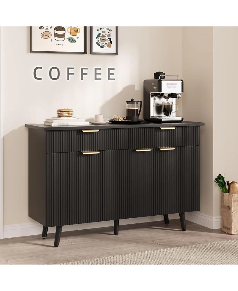 【Spacious and Adjustable Storage】: Easily organize your living room or dining room essentials with this black buffet cabinet, featuring 3 roomy cabinets, 2 deep drawers as part of a versatile sideboard with drawers, and 3 adjustable shelves. Perfect for storing dinnerware, table linens, or tall wine bottles, while the fluted textured doors add a designer-inspired touch to conceal clutter effortlessly. Rearrange shelves to fit stacks of dishes or decorative baskets【Durable and Mdf Construction】: Built to last with heavy-duty Mdf and reinforced wood legs, this durable sideboard buffet cabinet offers unwavering stability and scratch-resistant protection against spills and scuffs. Supporting up to 100 lbs on the tabletop, it s perfect for TVs up to 55 or holiday serving setups. Anti-tip hardware ensures child- and pet-friendly safety in any home environment.【Effortless Mobility and Quiet Operation】: Designed for hassle-free moving and noise reduction, this compact 47-inch wide