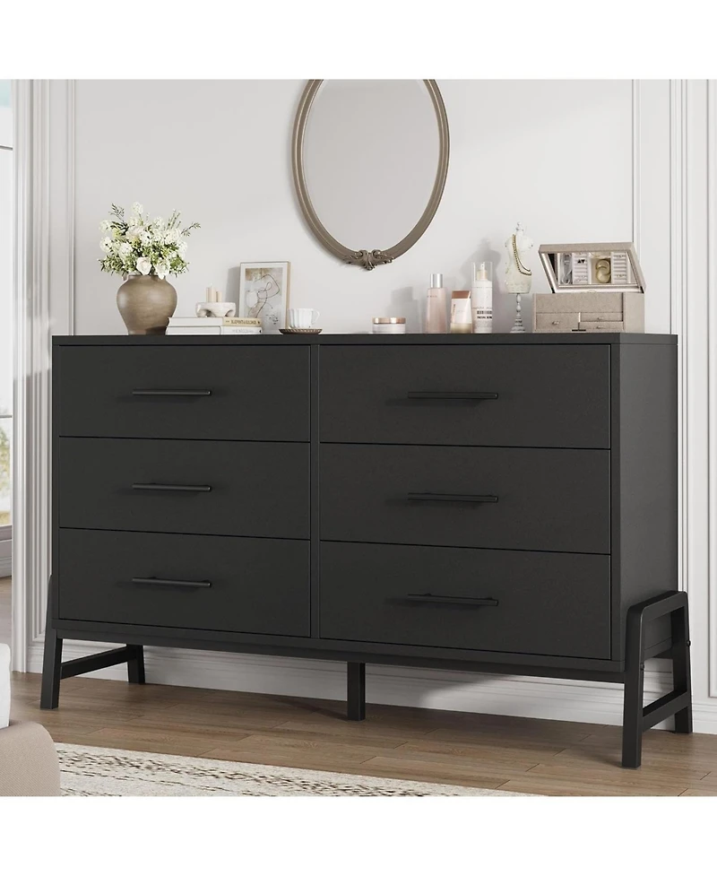 Chic Design: This dresser features a unique cabinet leg design, with sturdy legs that ensure overall stability and a modern, visually striking look. The open space beneath allows most robot vacuums to pass through easily, making daily cleaning more convenient.ample Storage Space: With six ultra-deep drawers, this dresser offers plenty of room for all your daily essentials. The spacious tabletop is ideal for small items, lamps, or decorative pieces, letting you showcase and enhance your room's decor.versatile Style: Blending country charm with modern aesthetics, the chic legs, clean lines