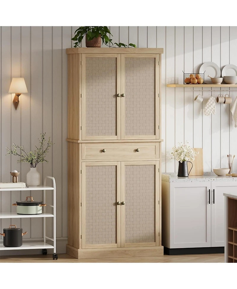 【Huge Storage Capacity with 4 Doors and Drawer】: This spacious pantry cabinet features 4 doors and a large drawer, providing ample space for food, dinnerware, kitchen appliances, and more. Perfect as a kitchen pantry or tall storage cabinet with doors to organize your kitchen, dining room, or living room.【4 Adjustable Shelves for Customization】: Equipped with 4 adjustable shelves, this kitchen storage cabinet allows flexible height adjustments to accommodate items of all sizes. Ideal for kitchen cabinet storage and versatile pantry needs.【Heavy-Duty Weight Capacity】: Each robust shelf supports up to 180 lbs, making this kitchen pantry cabinet suitable for heavy appliances, office supplies, and more. Engineered for stability and durability in any setting.【Versatile Farmhouse Design】: Featuring beadboard doors, metal handles, and sleek lines, this farmhouse-style kitchen cabinet blends seamlessly into kitchens, bathrooms, studies, or dining rooms. Waterproof Pvc.