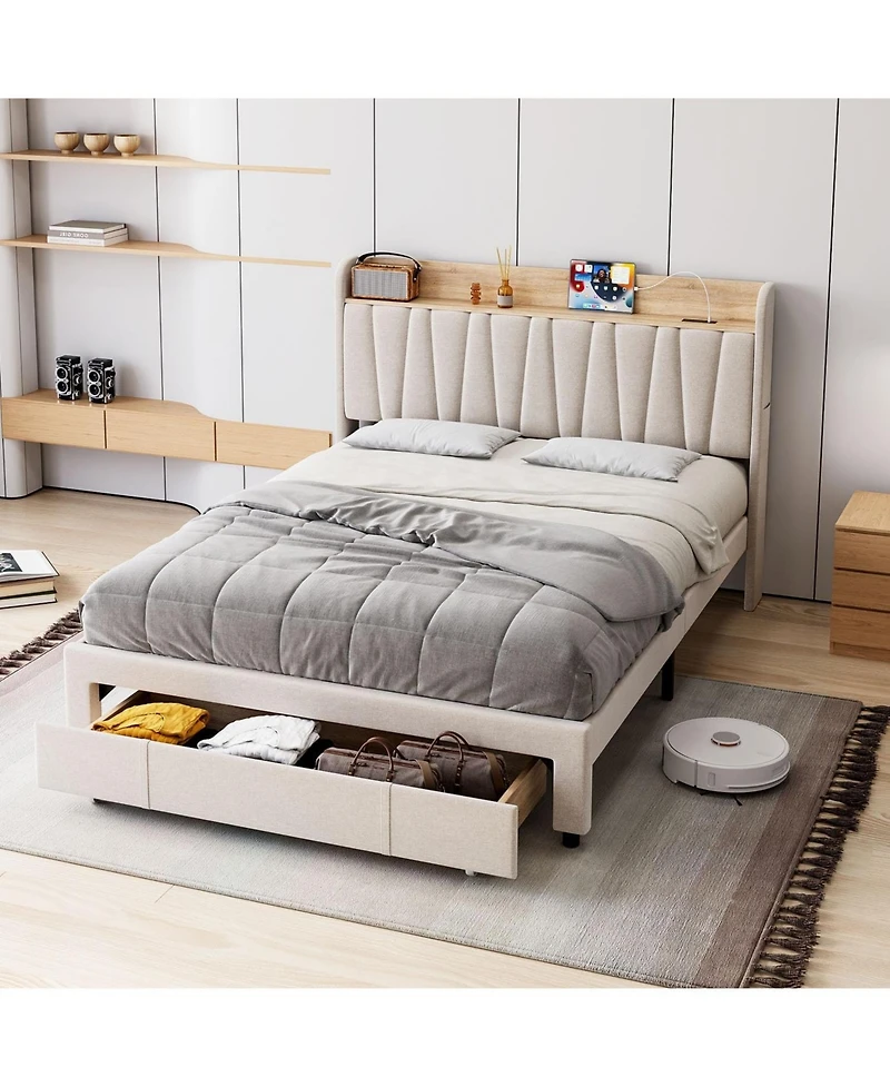 [Storage Headboard with Charging Function] This drawers platform bed frame with storage charging station, which is convenient for you to place your mobile phone, photos, glasses, and other devices on it so that you can easily get to them while lying on your bed, and also charge your mobile phone and laptop within reach.[Bed Frames with Storage Drawers] Our king bed frame with a charging station and roll-out steel bed storage drawers for shoes, suitcases, luggage, and clothing make efficient use of the bed space. Keep your room neat and organized while meeting all your storage needs.[Noise-Free and Sturdy] Our upholstered platform bed with headboard is made with high-density foam for a soft and breathable lying experience. The bed frame consists of a sturdy metal frame with thickened wood slats that can hold up to 1,000 pounds. Additionally, this king size bed frame with drawers is soundproofed to eliminate squeaks and ensure a restful night's sleep.