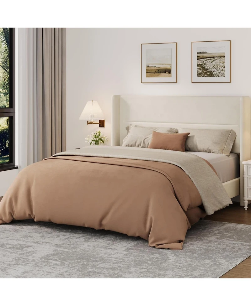 Modern Wingback Headboard: The elegant wingback headboard design adds a touch of luxury to the bedroom. The headboard is made of velvet fabric, which is soft and comfortable.sturdy And Durable: Our platform bed frame features a sturdy metal frame and wooden slats for durability, with quiet foam that won't squeak or sway.8" Under-bed Space: The upholstered bed has an under-bed height of 8 inches, providing ample storage space for shoes, storage boxes, luggage, and allowing a robot vacuum to easily clean underneath the bed.no Box Spring Needed: Platform beds feature solid wood slats, eliminating the need for a box spring and allowing you to place your mattress directly on top