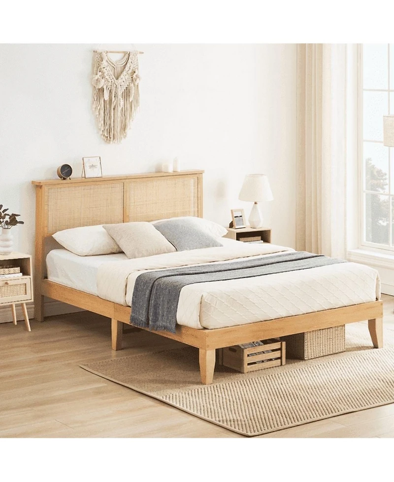 Gaomon Boho Bed Frame, Rattan Headboard Bed Frame With Led Lights, Noise-Free Platform Light Wood Bed Frame in Bloomington, MN