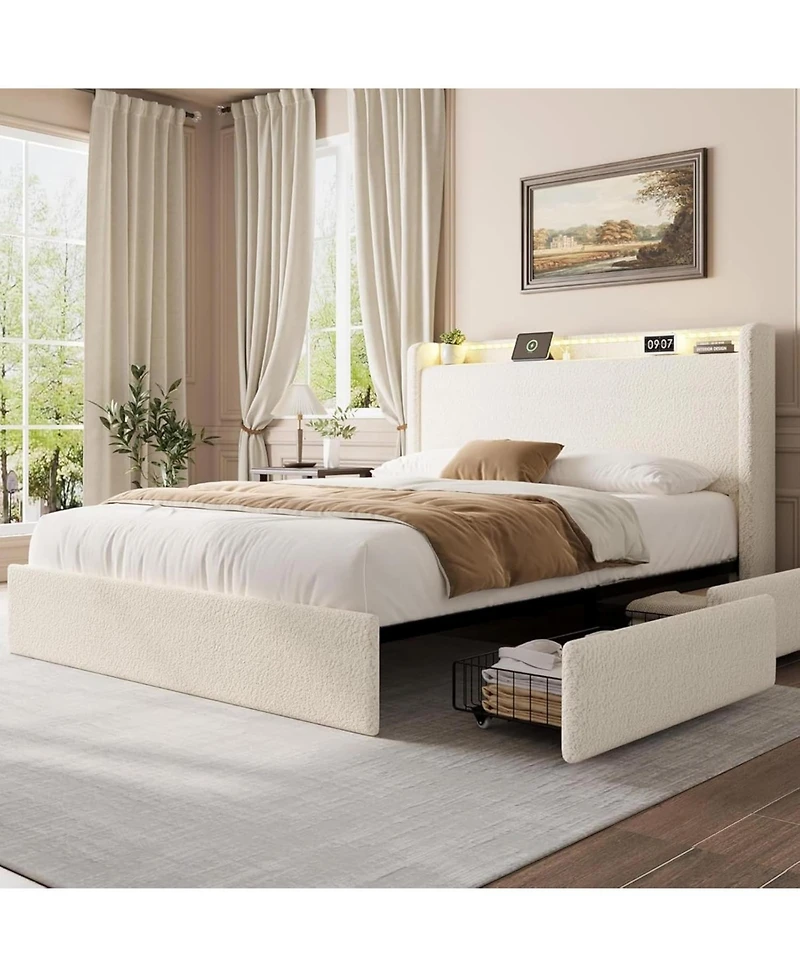Boucle Full Bed Frame with Storage Headboard, Upholstered Bed Frame Full Size with Charging Station, Led Lights, 4 Storage Drawers, No Box Spring Needed, Noise Free, Beige