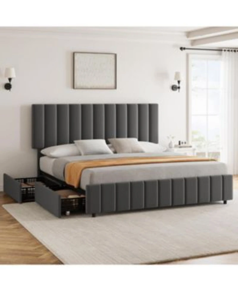 【Solid Support for Sweet Dreams】This full-size bed frame features 12 durable wooden slats, supporting up to 800 pounds for a restful night's sleep. Eva foam padding ensures quiet sleep, eliminating noise disturbances【Luxurious Linen Comfort】Experience the plush comfort of breathable linen fabric that's both durable and easy to clean. The elegant vertical pattern design adds a touch of charm to your bedroom, creating a cozy retreat for relaxation【Customizable Headboard】Adjust the headboard of this full size platform bed frame to your preferred height, accommodating mattresses of 6-12 in for personalized comfort. The stable footboard keeps everything in place for undisturbed sleep【Smart Storage Solution】Maximize space with four spacious drawers that exceed a standard chest's capacity. Featuring convenient wheels and fixtures, organizing your essentials is a breeze while the smaller perforations allow for tidy storage of smaller item.
