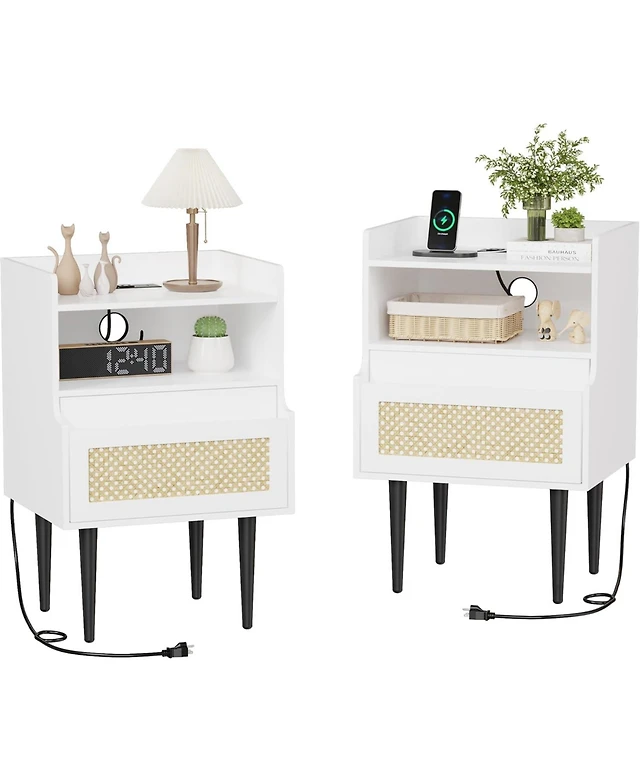 gaomon Nightstand Set of 2, Rattan End Table with Charging Station, 2 Open Shelves Beside Table with Drawer and Solid Legs, White