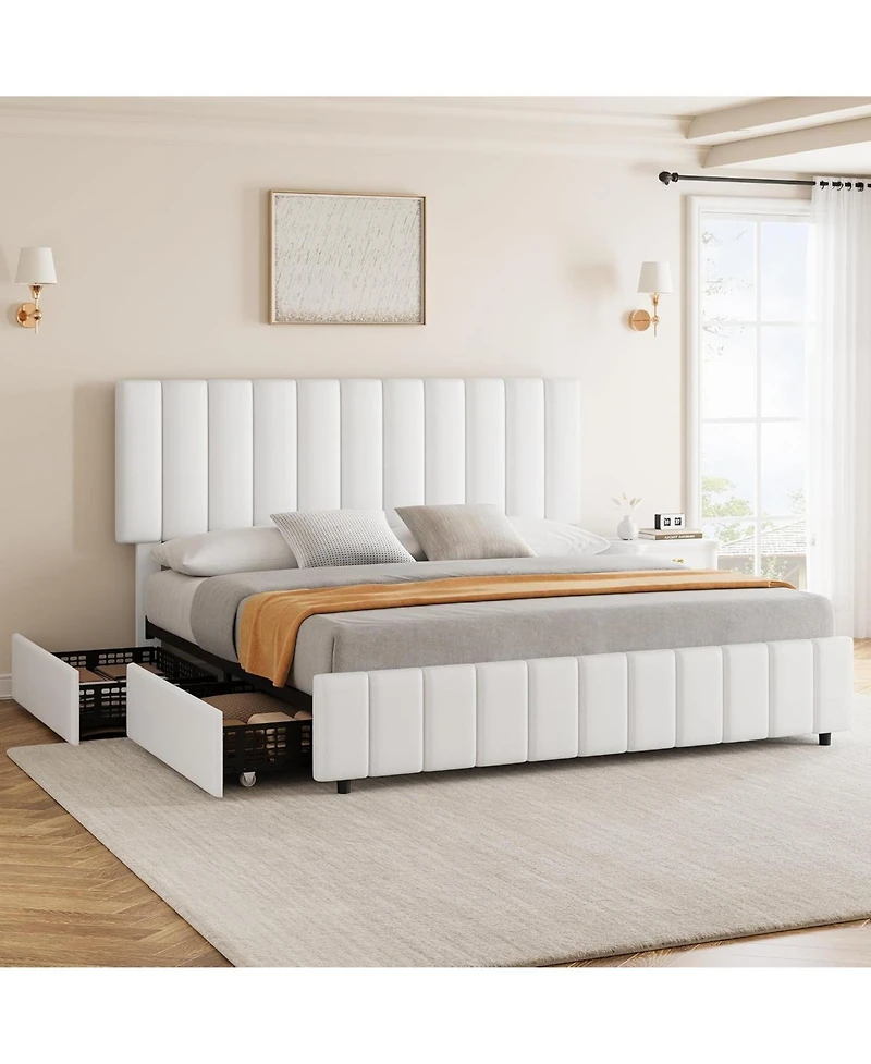 【Solid Support for Sweet Dreams】This queen-size bed frame features 12 durable wooden slats, supporting up to 800 pounds for a restful night's sleep. Eva foam padding ensures quiet sleep, eliminating noise disturbances【Luxurious Linen Comfort】Experience the plush comfort of breathable linen fabric that's both durable and easy to clean. The elegant vertical pattern design adds a touch of charm to your bedroom, creating a cozy retreat for relaxation【Customizable Headboard】Adjust the headboard of this queen size platform bed frame to your preferred height, accommodating mattresses of 6-12 in for personalized comfort. The stable footboard keeps everything in place for undisturbed sleep【Smart Storage Solution】Maximize space with four spacious drawers that exceed a standard chest's capacity. Featuring convenient wheels and fixtures, organizing your essentials is a breeze while the smaller perforations allow for tidy storage of smaller items【Silent Slumber