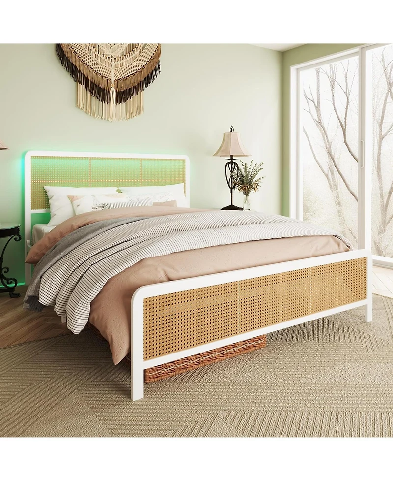 Unique Rattan Style: The rustic and synthetic rattan headboard and footboard add a touch of unique charm to your bedroom, while the sleek design of the bed frame complements any decor style. The rattan headboard offers a contrast against the smooth lines of the bed frame, making it an outstanding decorative piece.led Light Rattan Headboard: The rattan bed frame features a built-in Rgb Led light strip that provides a leisurely atmosphere for your night. Additionally, the Led lights will change color with the rhythm of the sound and music, making your bedroom experience more dynamic and fun.protective Design: The curved design of the headboard and footboard not only adds to the aesthetics but also provides a sense of security. The rubber non-slip pads under the legs protect your floor from scratches and keep the bed frame stable.sturdy And Durable: Crafted from durable Pe rattan cane and heavy-duty metal support frames, this bed frame is robust and reliable and