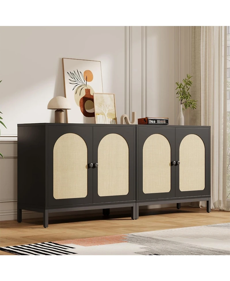 [Rattan Aesthetic]Our rattan sideboard buffet cabinet features double arched doors decorated with rattan weaving, showcasing the unique beauty of rattan. Blend natural finish and rattan decorated door surface, this entryway cabinet bring pleasing visual effects to your living space..[Large Storage Space]With 2 rattan doors, 3-level adjustable shelf, and a spacious desktop, you can store your display items, kitchen dinnerware, decor, kitchen tools and storage jars all in this large sideboard buffet cabinet..[3-Level Adjustable Shelf]The kitchen storage cabinet includes adjustable shelf with 3 height options, each differing by 1.18 in. You can customize the space for your needs..[Durable and Stable Design]The sideboard buffet cabinet is built with durable thick particle boards and metal feet to provide lasting quality. Comes with anti-tip kit, preventing it from tipping over, protecting children's safety. The metal feet features adjustable foot pads