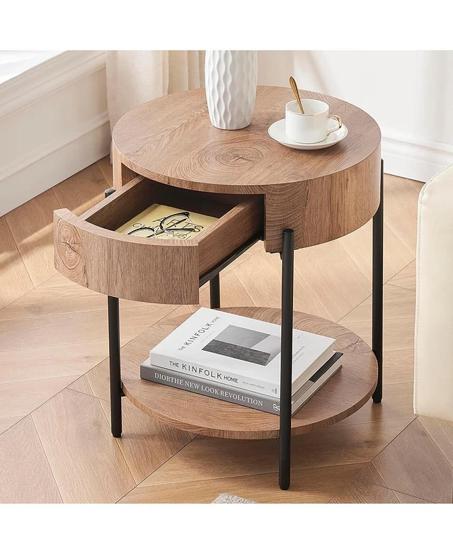 gaomon Round End Table Wood Side Table with Drawer Farmhouse Circle End Tables Accent Bedside Table Metal Frame Small Nightstand for Living Room, Bedr