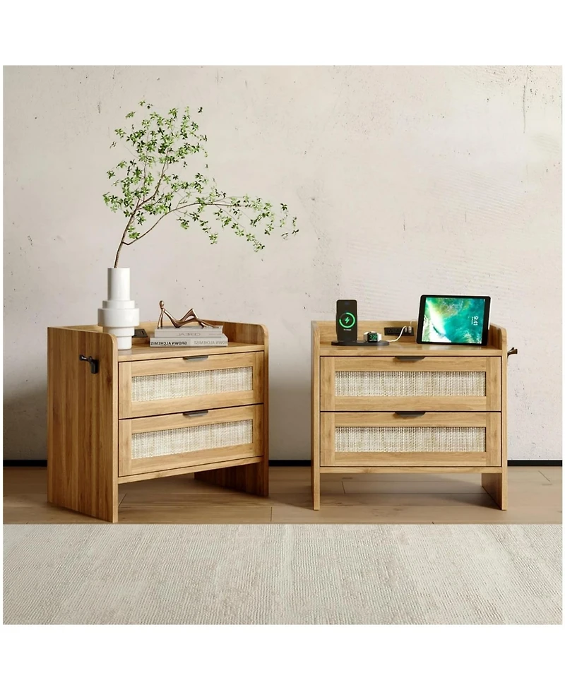 gaomon Set of 2 Walnut Brown Rattan Nightstands, 2-Drawer Bedside Table with Type-c Charging Station in Bloomington, MN