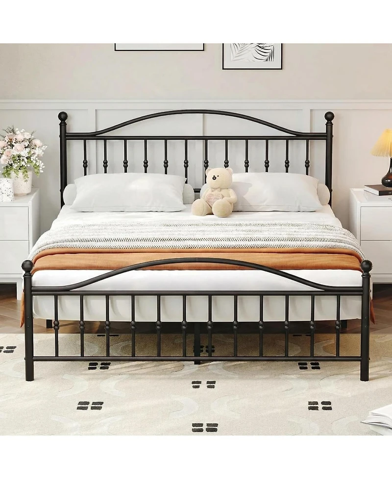 【Elegant and Classic】This black metal bed frame features an ornate Victorian-style headboard and footboard with delicate beaded accents. Its vintage design adds timeless romance and classic charm to any bedroom, perfectly blending with modern, farmhouse, rustic, or traditional decor styles..【Durable and Strong】Our all-metal bed frame offers incredible durability and support, requiring no box spring. The reinforced steel slats provide a sturdy mattress foundation for queen size mattresses, ensuring long-lasting stability and reliable weight capacity for a restful sleep..【High Headboard and Under Bed Storage Space】The tall headboard provides comfortable support, perfect for leaning against soft pillows while you read or watch Tv. Plus, with 12.6 inches of clearance underneath, this platform bed frame provides valuable under bed storage space for organizing bins, luggage, or seasonal items.