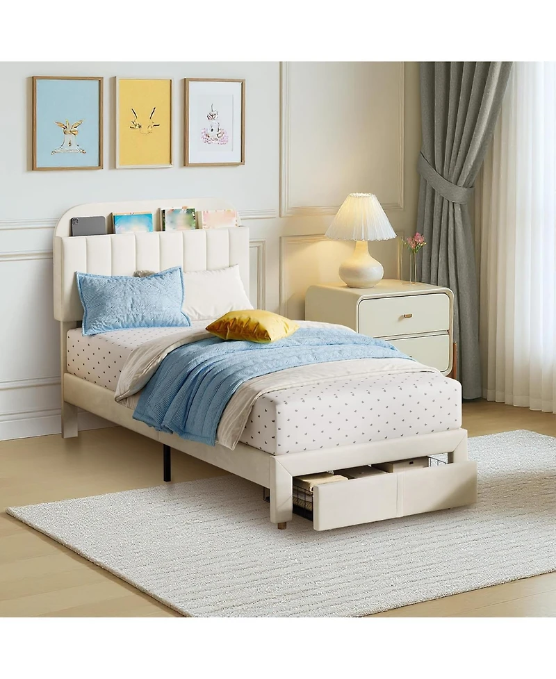 gaomon Twin Bed Frames with Storage Headboard, Velvet Upholstered Platform Frame Strong Wooden Slats