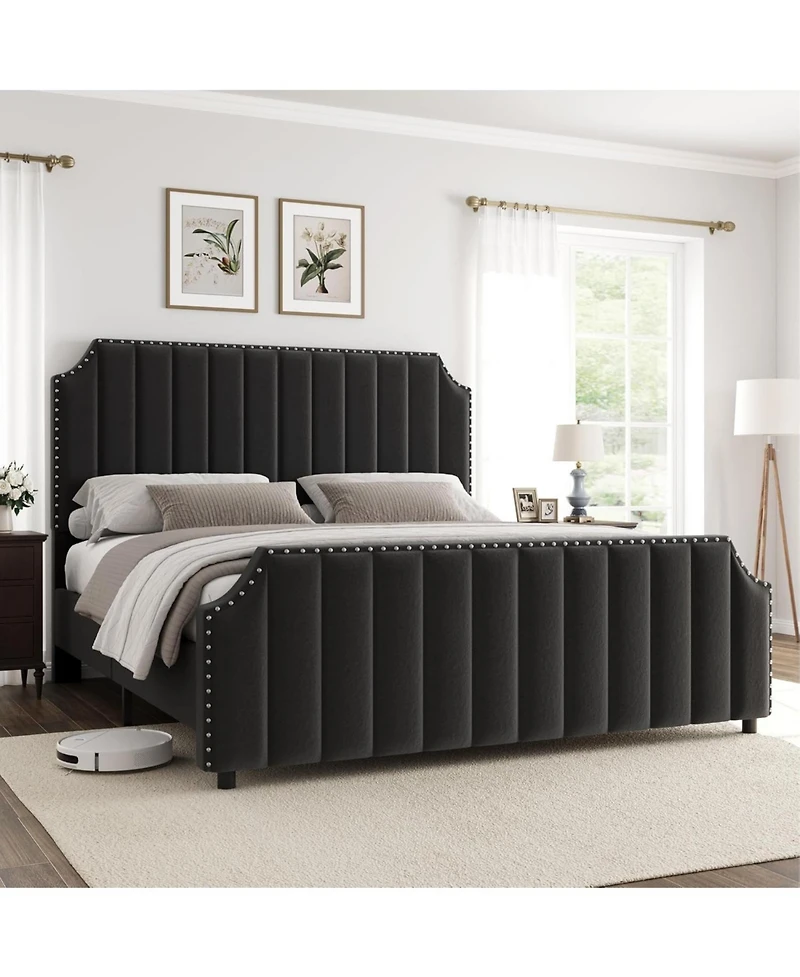 Add luxury to your bedroom with this velvet king bed frame. A 50.2" tall channel-tufted headboard and footboard, nailhead trim, and sturdy platform design in black ensure comfort and style.