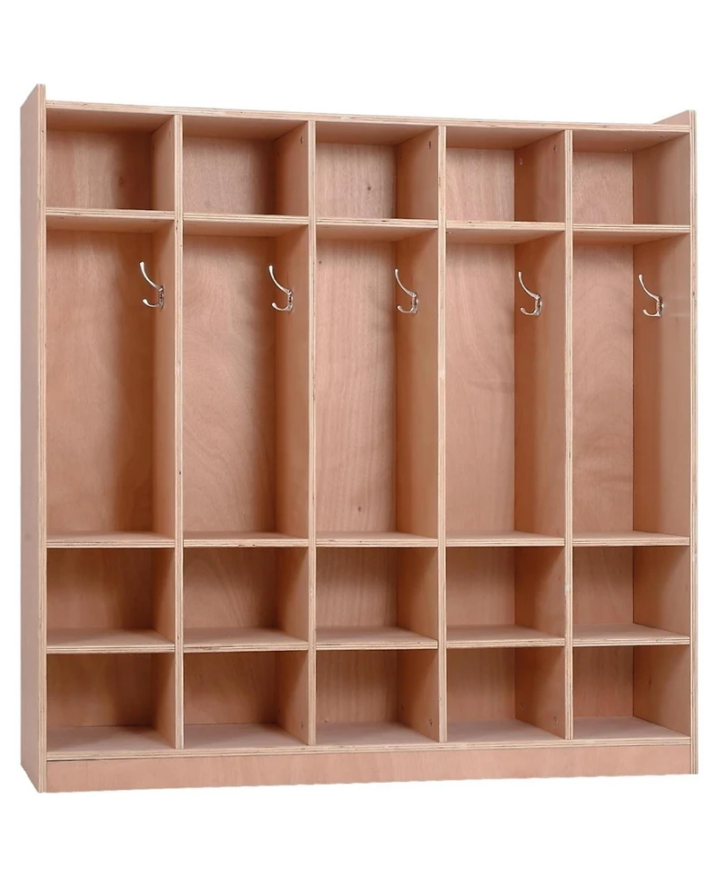 This wall mounted cubby storage organizer features 15 cubbies, 5 open shelves, and 5 double side hooks, made from durable plywood with a clear lacquer finish and includes an anti-tip kit for safety in classrooms or play areas.