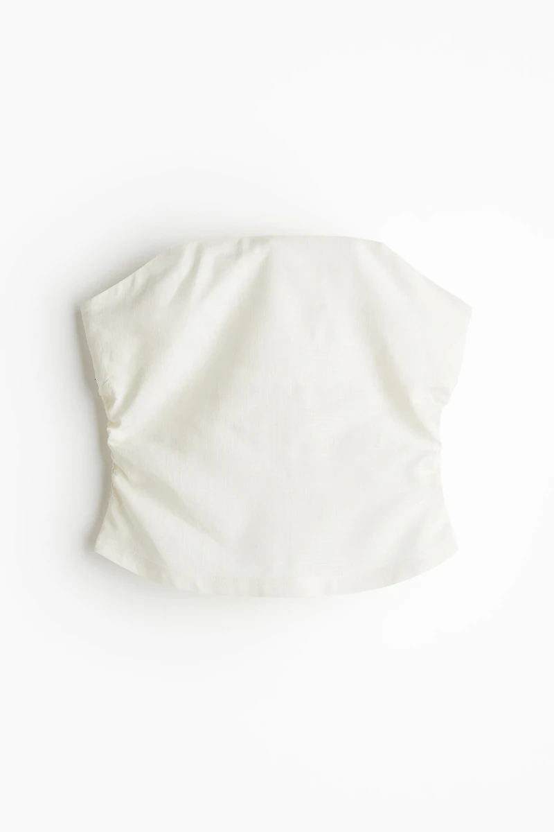 Short, corset-style bandeau top. Side-seam gathers for a gently draped effect and a concealed zipper at back with hook-and-eye fastener. Unlined.