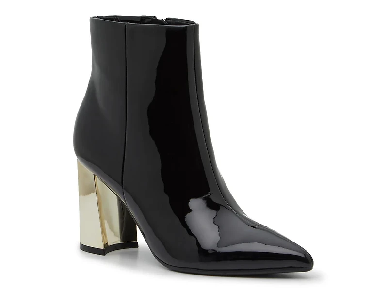 Sharpen up your layered look with the Gaylen bootie from Marc Fisher. A patent finish and metallic block heel catch the eye, while the classic silhouette ensures styling versatility.