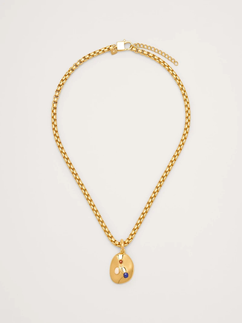 A trio of gems accent the wavy, sculptural façade of this sparkling pendant, set against this chunky box-style chain—in your choice of 14k-gold or 999-silver plated brass. 14k-gold or 999-silver plated brass. Lobster clasp. Red jasper, lapis lazuli, and resin stones. Length: 18" with 2" extender.