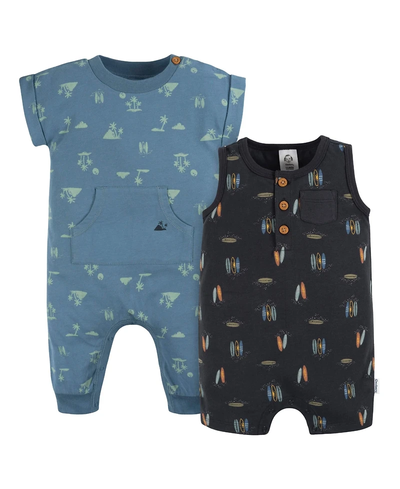 Elevate your baby boy's summer wardrobe with our two-pack of rompers, designed for all his sunny day adventures. Crafted from 100% cotton, these rompers are exceptionally soft with a slight stretch to the material, providing a comfortable all-day fit for your little one during those warm, sunny days. The gentle fabric is perfect for sensitive skin, and easy to clean with machine washing. These summer baby rompers get your little one s closet ready for warmer months! Our essentials have been independently certified with Standard 100 by Oeko-tex so that you don t have to worry about harmful substances in your baby s wardrobe. Includes two rompers.