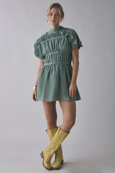 Check out this Ghospell mini dress in a green gingham printed fabric. Gingham dress featuring a mock neck, short sleeves and ruched bodice for added shape. Topped with ruffled trims for a playful finish.