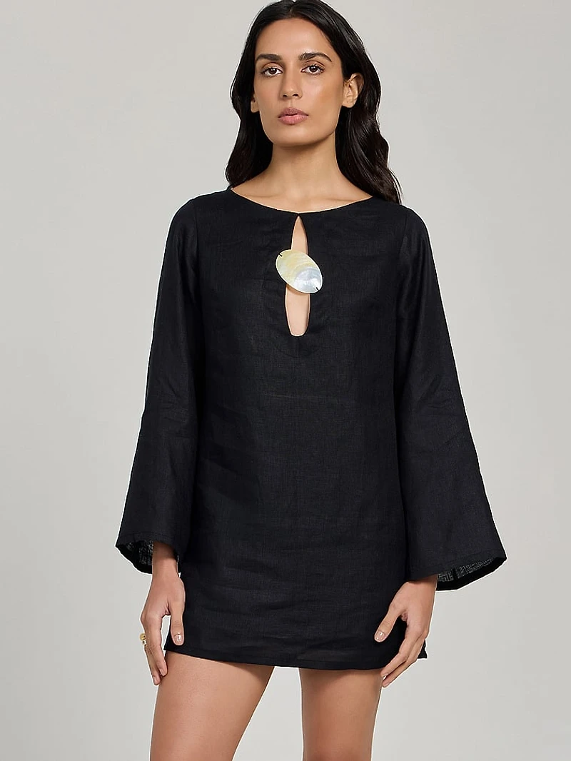 Warm breeze, clear nights, and this chic Dress. Full, flowing sleeves and a flirty mini length create an alluring silhouette, while a cutout detail finished with a shell button adds a vacation-ready feel. Pair with your favorite Sandals.