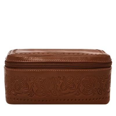 Crafted from leather, this travel case is designed to keep your watches secure and organized. Its compact silhouette is streamlined for easy packing, while the soft interior helps protect delicate finishes. Inside you'll find padded removable cushions; a built in flap for extra protection and a zip compartment for your smaller treasures. A zip-around closure keeps everything in place, making it a practical addition to your travel essentials. The embossed design takes cues from vintage bandana motifs—an iconic reference to the rugged, collected spirit of Americana.Fossil leather products support responsible manufacturing via the Leather Working Group.