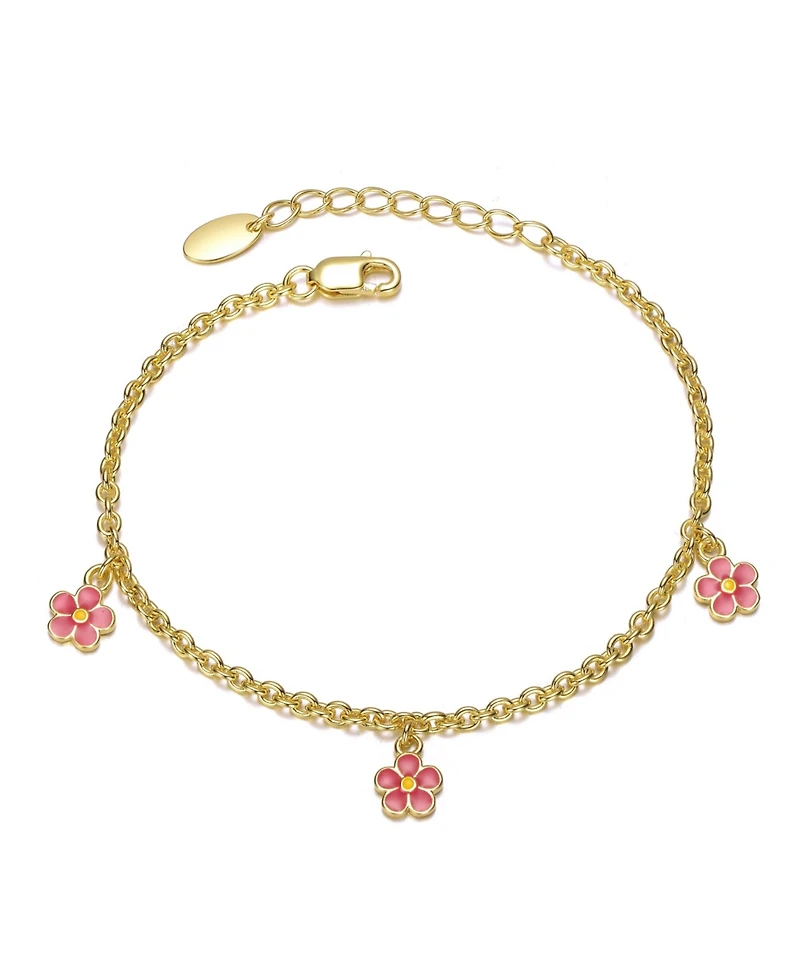 This super-sweet sterling silver 14K Gold Plated dainty link bracelet is ideally suited for giving as a gift to your little loved ones for meaningful occasions, or just because. Showcasing adorable bright flowers with yellow enamel in the middle, this bracelet s bright shine draws attention to its chic design. It features three flower charms and is adjustable, measuring 5.5+1 inches. The bracelet is secured with a lobster clasp and is available in fuchsia pink and Tiffany blue enamel petals.